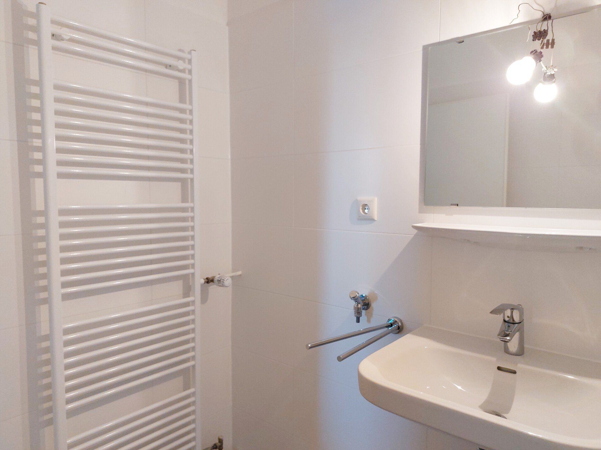 Das Badezimmer ist weiß gefliest und mit Badewanne, Waschbecken, Handtuchhalter, Handtuchheizkörper, Spiegel sowie einem Waschmaschinenanschluss ausgestattet.