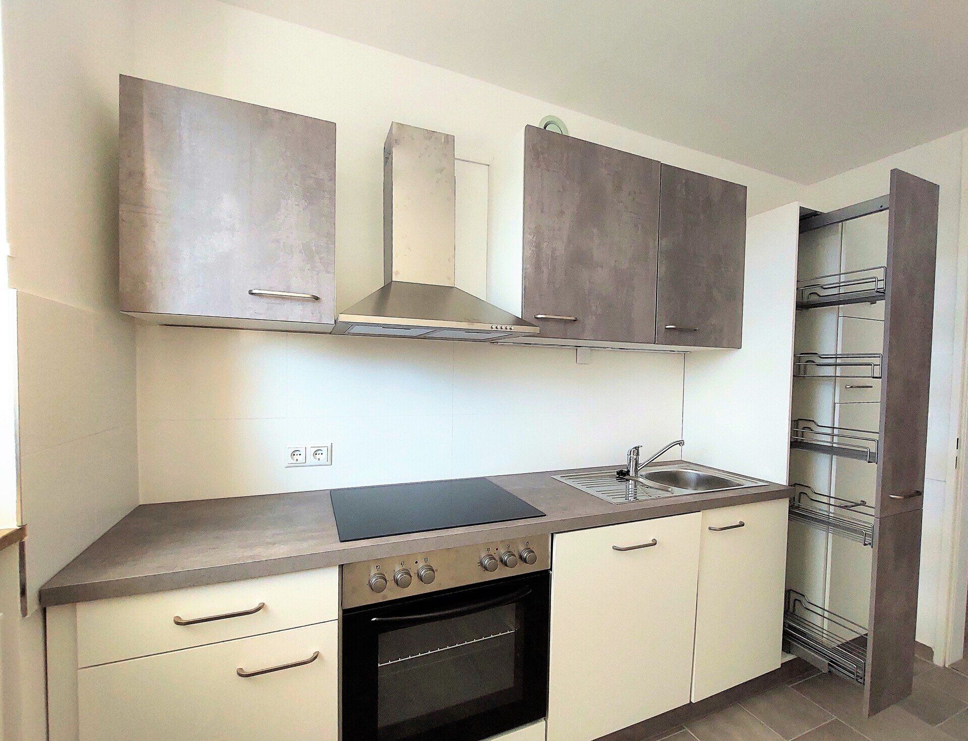 In der absolut neuen Einbauküche sind Backofen, Herd mit Cerankochfeld, Geschirrspülmaschine, Kühl- und Gefrierkombination und eine Dunstabzugshaube integriert. Die Ober-und Unterschränke und ein Apothekerschrank unterstützen die praktische Vorratshaltung.